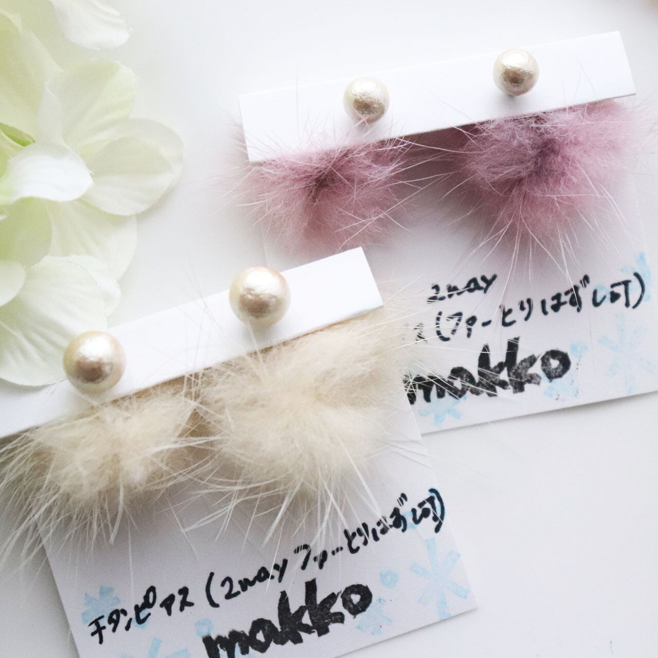 また、こちらのファーはキャッチにファーをぶら下げているので、お手持ちのキャッチに変えていただくことで小粒のコットンパールだけでも使用できます☆